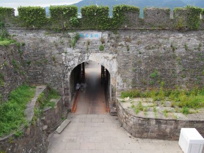 揽胜门南边不远处有一段通往山下在山下断头城墙,鉴于山下正前方的崇和门,猜测这段城墙原本应该是跟崇和门贯通连接的。