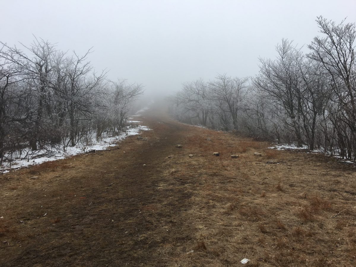 继续前进,路有两条,一条是延伸向另一个方向的防火带,另一侧则是一条小路,当然小路的尽头就是防火带越过巨石出现在巨石后方的防火带的延伸,这是一段坡度非常平缓的山路,延伸在山脊上,由于处于迎风坡,所以防火带两侧枯枝上的冰花比之前所见的更厚更美丽,毫不夸张地说,让人窒息,即使风从底下的山谷猛烈吹上来,仍忍不住想多看一会。