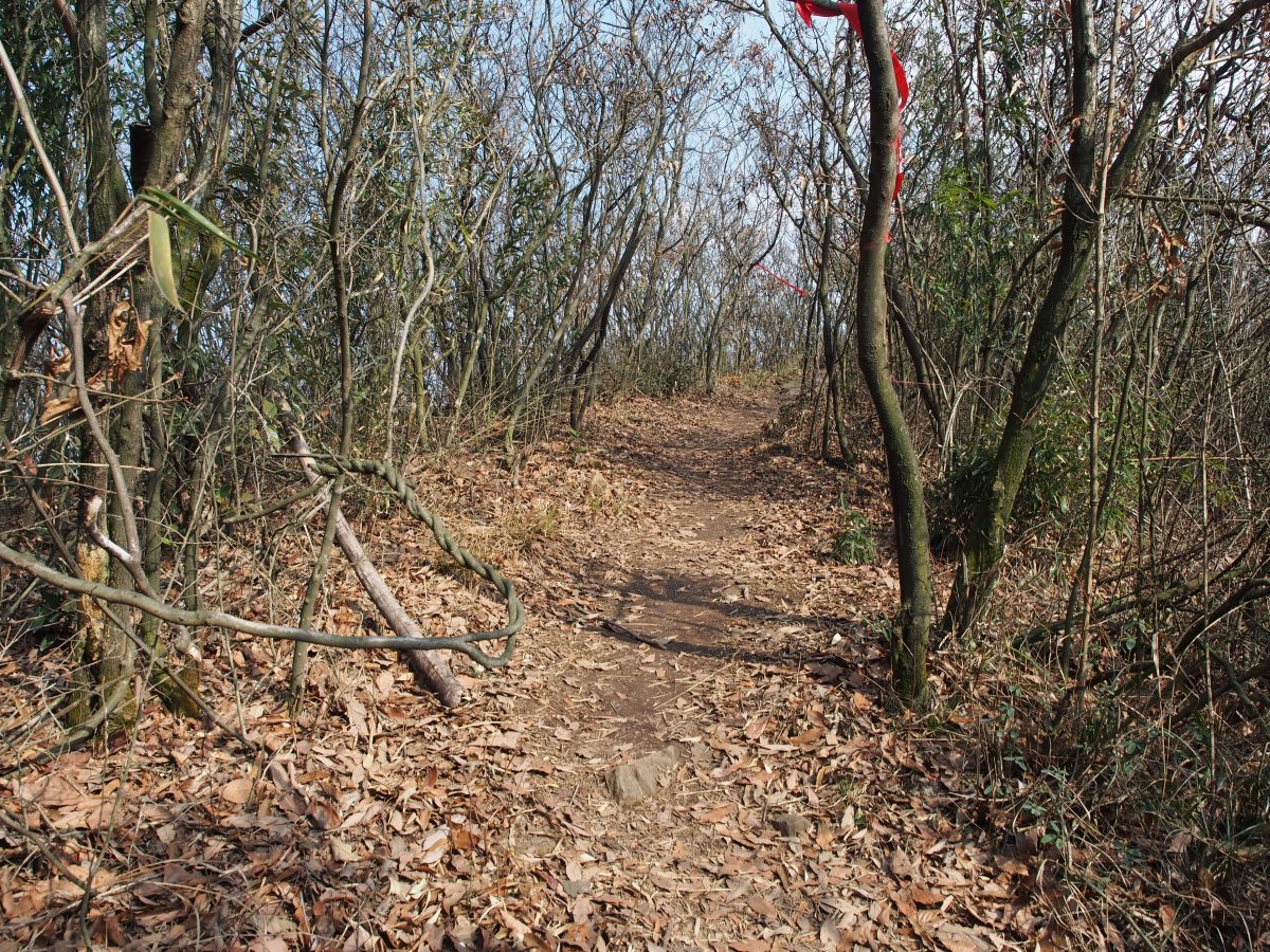 如果顺着石阶一直往上走会到达一处狭小的山鞍,此处有个牌子注明这条山路是岭下村的健身步道,有这样的休闲步道,村里人太幸运了。左右两侧的山脊上都有道路可走,左首边那条通往海拔最高处的黄塔顶。